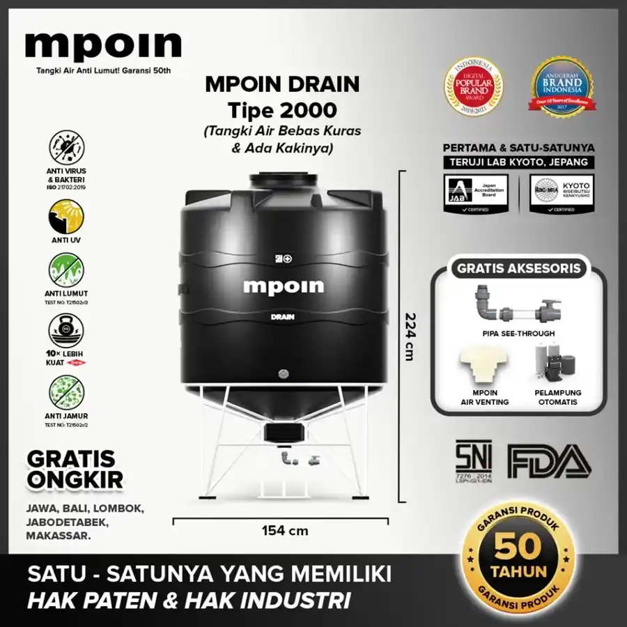 Tangki MPOIN Drain adalah pilihan ideal untuk kebutuhan air bersih rumah tangga. Dikenal juga sebagai tandon kaki atau toren kaki, produk ini dilengkapi teknologi Total Flush System dan pipa transparan (see-through pipe) yang memudahkan pengurasan hingga bersih tanpa repot. Dengan kaki penyangga dari besi beton utuh 14 inch dan bahan LLDPE (Linear Low-Density Polyethylene), tangki ini tidak hanya kuat menahan beban penuh, tapi juga tahan lama hingga 50 tahun.
